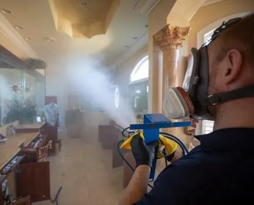 All people and pets must vacate the home during treatment. The high concentration of dry fog is not healthy to breathe. The fog dissipates completely after treatment.